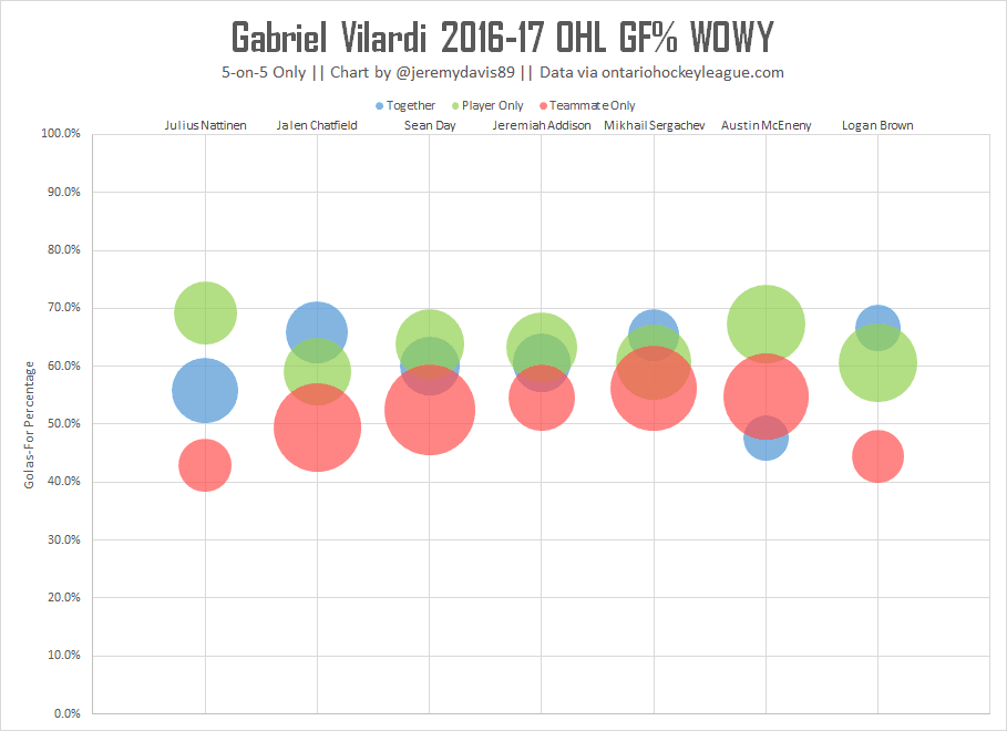 While we can’t verify that ourselves, we do have access to on-ice goal data, and it emphatically supports Thompson’s assertion. Each player fairs worse away from Vilardi, in some cases swinging as much as 10 or 20%.
