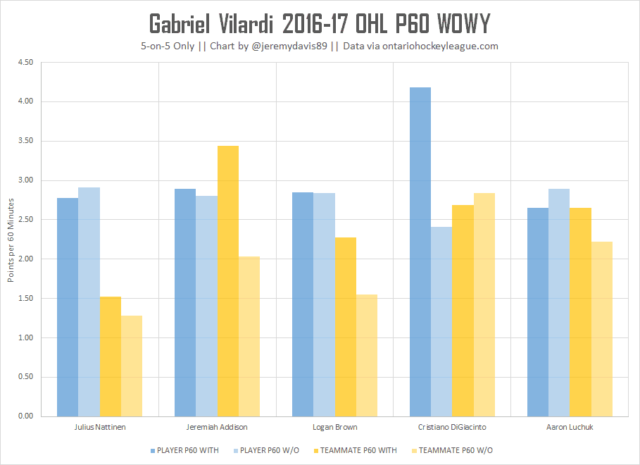 On-ice results are not the only area in which Vilardi helps his teammates. They are tend to produce better while playing with him than away from him. Consider the following chart, plotting the 5-on-5 Points per 60 minutes of Vilardi and his most common linemates together and apart. For the most part, the teammates’ production rates take a sizable hit when they aren’t on the ice with Vilardi, sometimes substantially so (like in the case of Jeremiah Addison). This is particularly interesting because when they werenèt playing with Vilardi, they were playing with Vilardi’s older, star teammates Logan Brown and Jeremy Bracco.