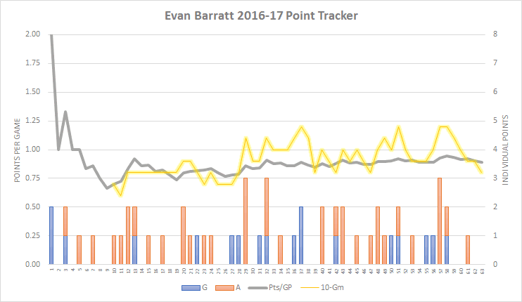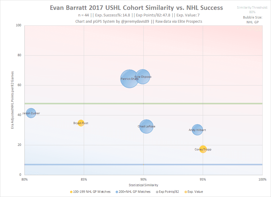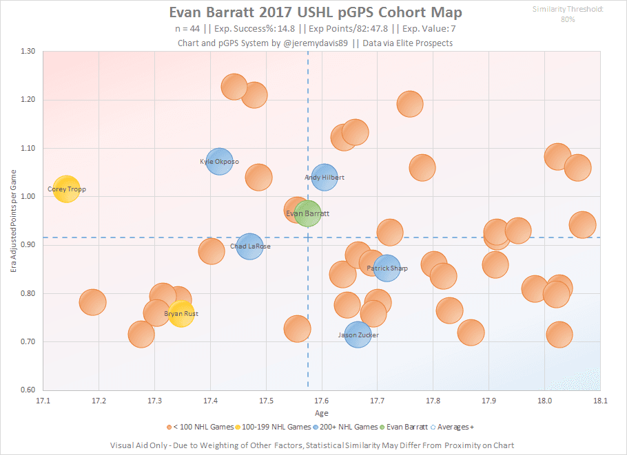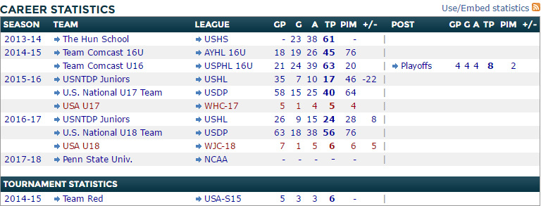Even though he was behind a similarly skilled prospect like Norris rather than an elite centre, Norris was still somewhat boxed into a specific role, as can be the case in that program. At even strength, his numbers were actually slightly better than Norris’, and during the USHL portion of the NTDP schedule, Barratt trailed only Andrei Svechnikov, a projected top 2 pick in 2018, in primary points per game at 5-on-5. In terms of overall points, his numbers against college and international competition were very similar to those against USHL teams.