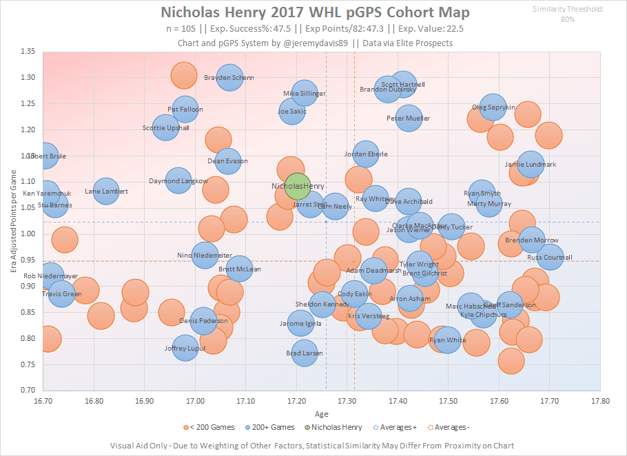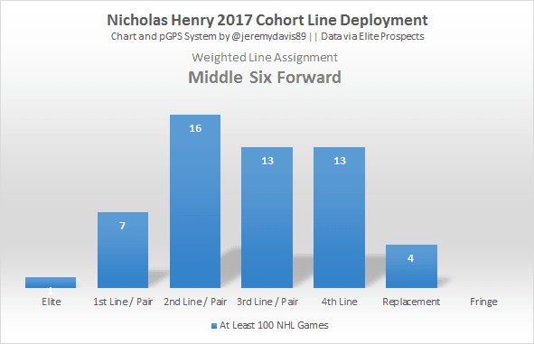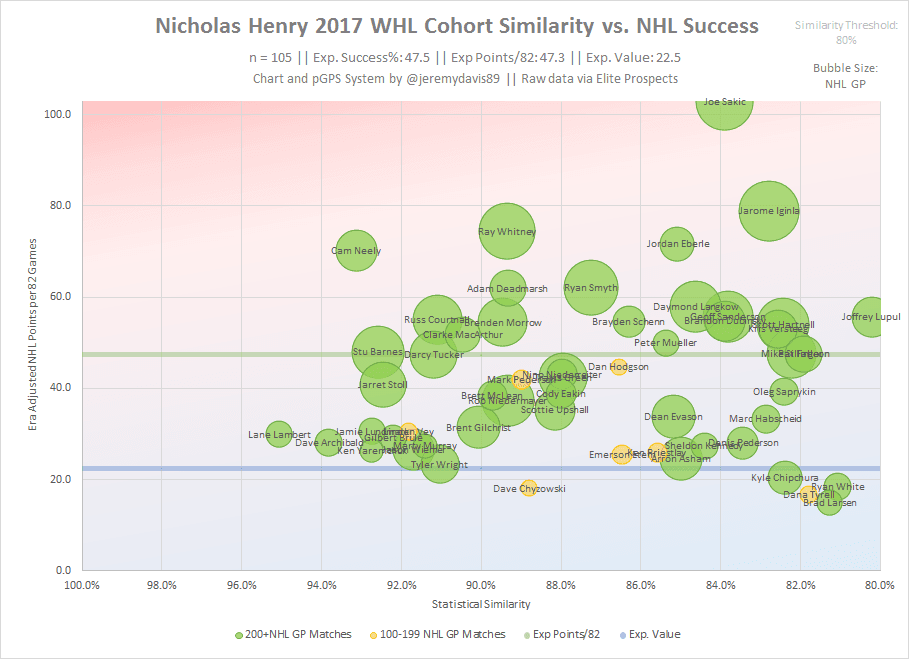 The prospect Graduation Probabilities System (pGPS) shines a very favourable light on Henry, who carries an expected success percentage of 47.5%, and his expected production is 47.3 points per season, indicating a player who’s value is roughly comparable to that of a mid-to-late first-round pick. Henry’s closest successful cohorts include Jordan Eberle, Cam Neely, Ray Whitney, and Jarret Stoll.