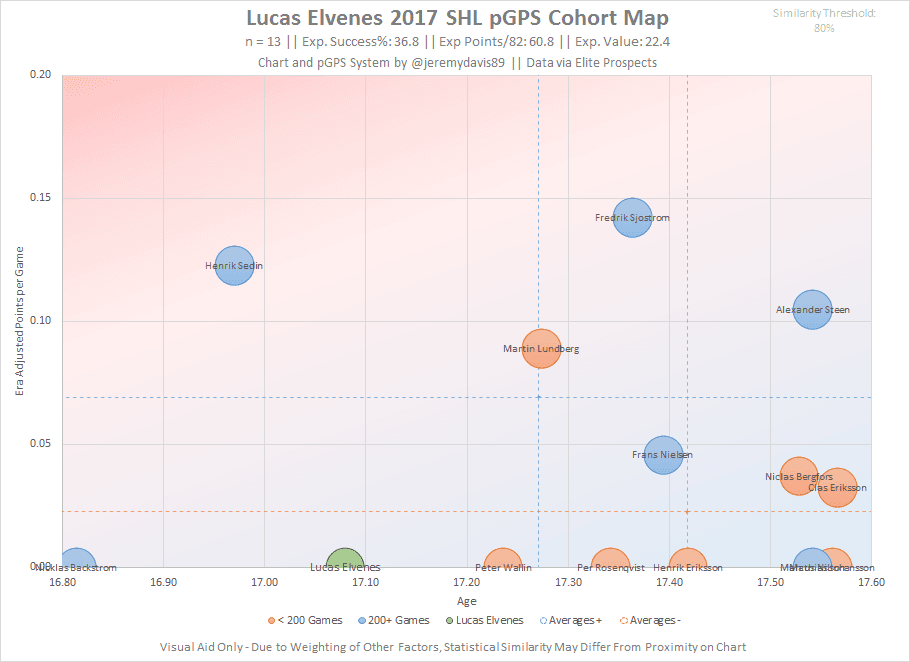 I’ve included the bubble charts for both leagues with reference to Elvenes’ cohorts, so you can get an impression of the type of players that he’s matched up with historically. At the pro level, it’s basically the same group as Zetterlund, which includes Nicklas Backstrom and Frans Nielsen. One match in Elvenes’ cohort that wasn’t present in Zetterlund’s is Henrik Sedin.