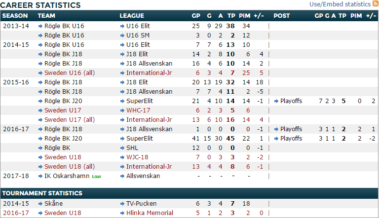 Elvenes showed improvement in his production rate over the course of the season in junior. He was a point per game player in the first leg of the Superelit season (24 points in 24 games), but upped that to 21 points in 17 games during the second leg. Like Zetterlund’s Farjestad BK though, Elvenes’ Rogle BK spent the second leg in the Continuation group – that is, the bottom five teams from each conference, which should equal slightly easier competition. His boost from one leg to the next was not nearly as pronounced as Zetterlund’s was, so I’m more inclined to say that the change in competition accounted for a greater portion of the improvement on offence.