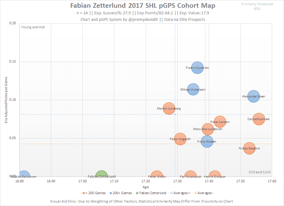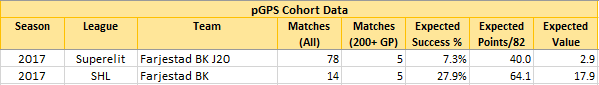 As is typically the case with European plays splitting their seasons, Zetterlund has a higher expected likelihood of success and higher expect value in the professional ranks of the SHL than the junior ranks of the SuperElit league, despite that fact that he scored zero points in the former and 36 points in the latter. This should come as no surprise, since playing professional hockey at 17 or 18 is a great sign of future success, and even a minimum amount of points can be a precursor to success.