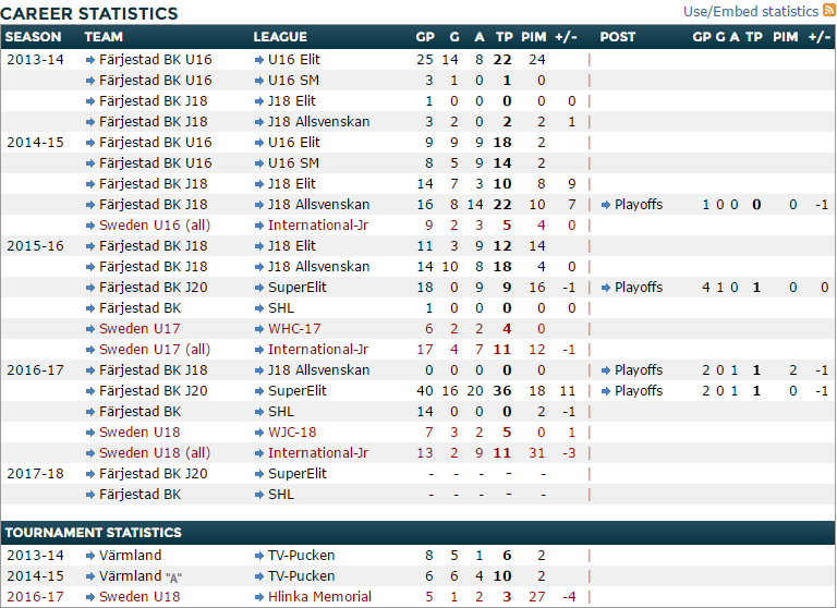 During his time in the SHL, he put just seven shots on net in 14 games, but when you consider that he averaged just 3:23 of ice time per game (with no special teams time), his shots per hour rate of 8.87 was actually one of the best in the league among junior-aged players, trailing only Joel Eriksson Ek and Carl Grundstrom (picked 20th overall in 2015 and 57th overall in 2016 respectively) in terms of players that played at least as many games as he did.