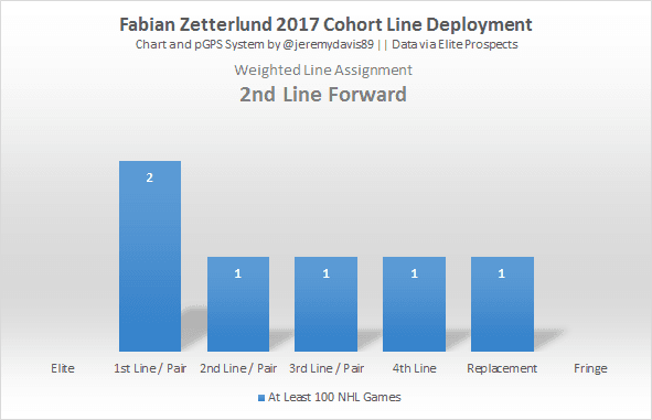 That certainly isn’t Zetterlund’s destiny – we’re dealing with probabilities here after all – but it’s an encouraging sign. Other members of his cohort include Alex Steen and Frans Nielsen. Nielsen, who the system pegged as a second line NHL forward, may be the most accurate statistical comparable if Zetterlund reaches his potential, as pGPS’s weighted line assignment pegs Zetterlund as a second liner himself.
