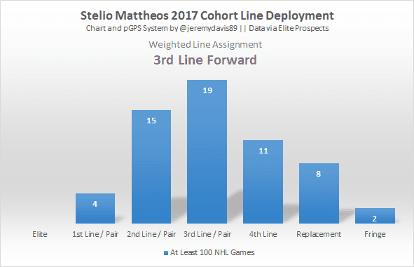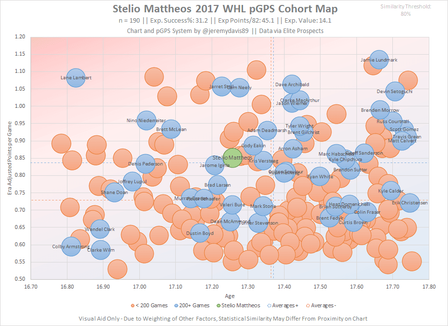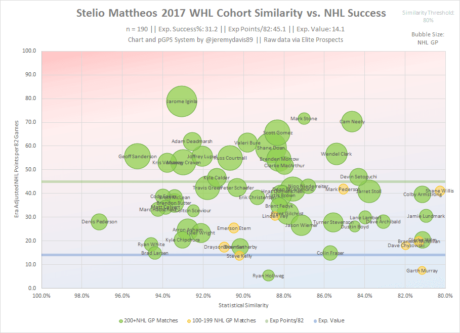 When viewed through the lens of pGPS, Mattheos looks like great value relative to where he’s expected to be taken in this year’s draft. He carries an expected success percentage of 31.2%, with most of his successful cohorts carving out roles as third-line forwards. Based on the eye test, I’d say Mattheos has a better than average chance of clearing that bar. Mattheos’ closest successful statistical cohort is, interestingly, Jarome Iginla, though it should be noted that Iginla is far and away the most successful match on the list. Following just behind Iginla are Kris Versteeg and Cody Eakin, which sets far more realistic expectations for what to expect from Mattheos’ from a production standpoint. If Mattheos makes the NHL, it will most likely be as a third-line checking centre with a a bit of offensive upside and sandpaper in his game.