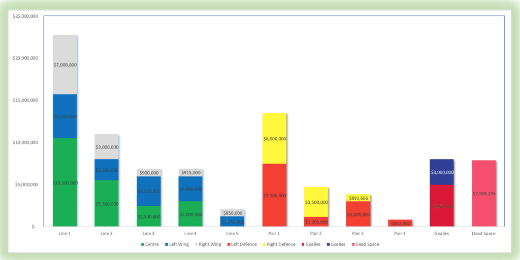 There is less balance in salary distributions with the huge deals given to Pettersson, Hughes, and Boeser. The lineup has four players on entry-level deals. The projected salary cap hit is $90.0 million, $3.0 million over the forecasted limit. There are many ways that the $3.0 million could be saved, but none of them are easy options.