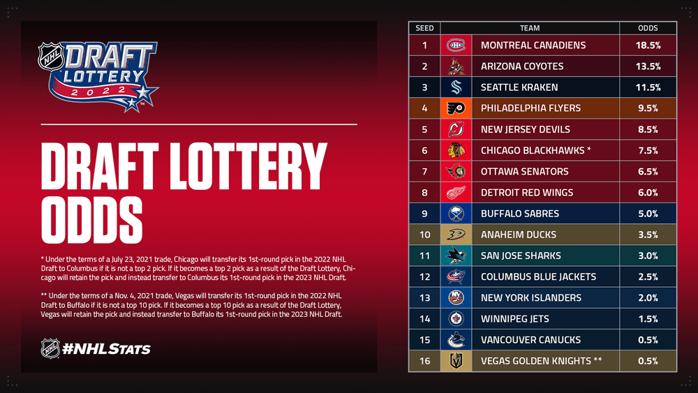 The draft lottery is designed to prohibit teams from “tanking” — icing a team that won’t be competitive in hopes of a better draft selection — and will determine the order of selection for the first 16 picks of the first round of the 2022 NHL Entry Draft.