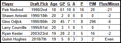 Not a lot of information to go on. Antoski, Courville, and Hughes only had a cup of coffee. Odjick was the prototypical enforcer and played that role perfectly. Kesler pretty evenly split his time between the NHL and AHL (28 NHL games and 33 AHL games) and was, impressively, able to keep his head above water defensively.