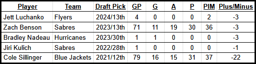 In recent seasons, at least one forward from the middle of the first round has made the NHL right after being drafted. There are three flavours of players from this small list: those who played the entire season (Sillinger and Benson), those who only received a taste of the NHL (Kulich and Luchanko), and those who signed a contract at the end of the NCAA season (Nadeau). Luchanko, Benson, Kulich, and Sillinger all made their respective team out of camp. None of the Flyers, Sabres, or Blue Jackets made the postseason in any of these seasons.