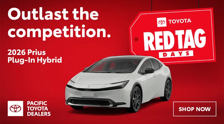 Need performance without compromise? Check out the Toyota Prius Plug-In Hybrid. Enjoy up to 72 km of electric range on battery alone. Heading farther for an away game? It seamlessly switches to gas for a combined 962 km range. It’s a total power play on the road with a sleek design and sophisticated, tech-loaded interior. Plus, you can recharge easily at home or utilize over 2,000 public charging stations in BC. Experience range, style, and versatility. Visit your local Pacific Toyota dealer during Red Tag Days for limited-time offers.