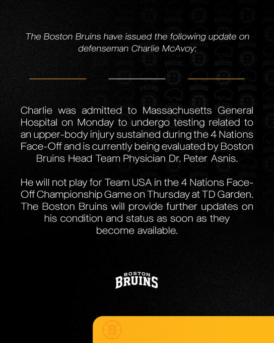 The #NHLBruins have issued the following update on Charlie McAvoy. 📰: bit.ly/4b6leW8
