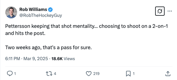 This does look like a good opportunity to try and buy-low on Pettersson from a shot volume perspective. It’s been visually apparent that he’s looking to shoot more over the last three matchups, and the numbers agree, as he has 14 attempts in that span. Surely, Tocchet will encourage this change of mentality, and the Canadiens are a fairly middling side in terms of shot suppression.