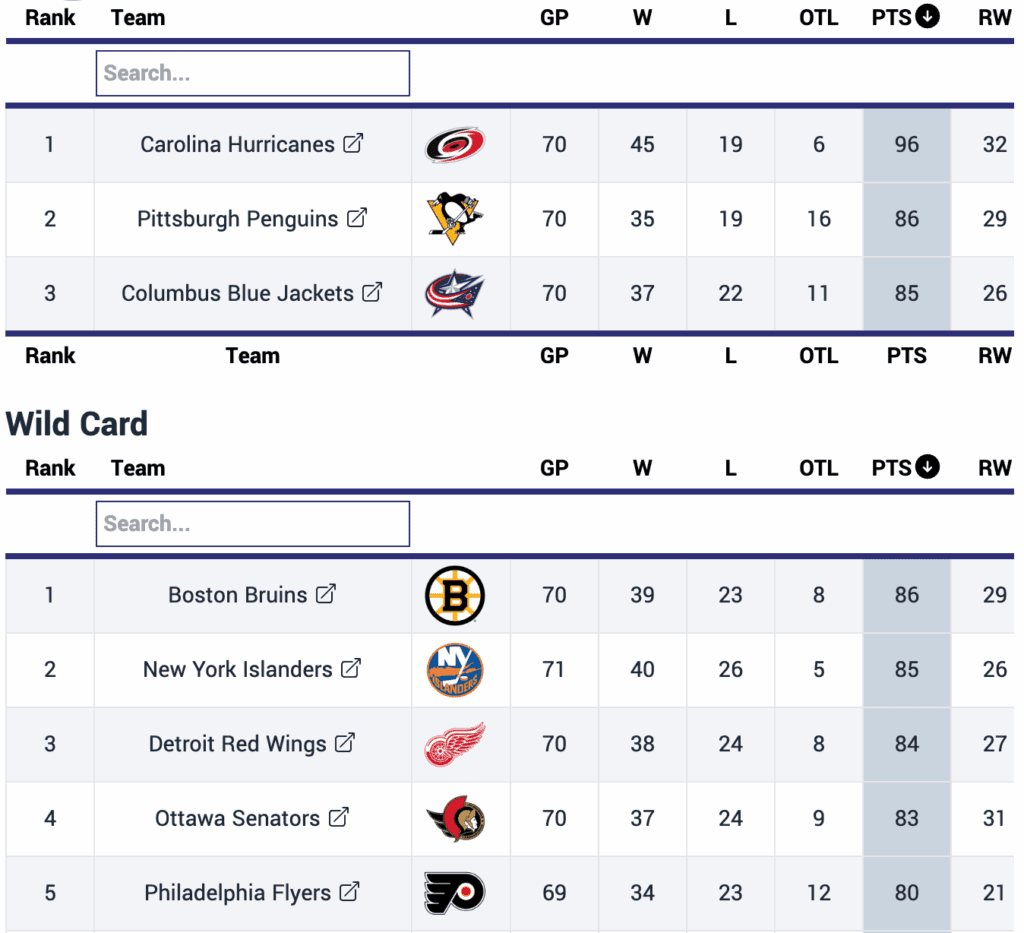 As you can see below in the standings, the line between being a playoff team, a wild card team, or missing the dance entirely is extremely slim for the Penguins, Blue Jackets, Islanders, and Bruins, with the Senators and Flyers hoping to make things interesting: