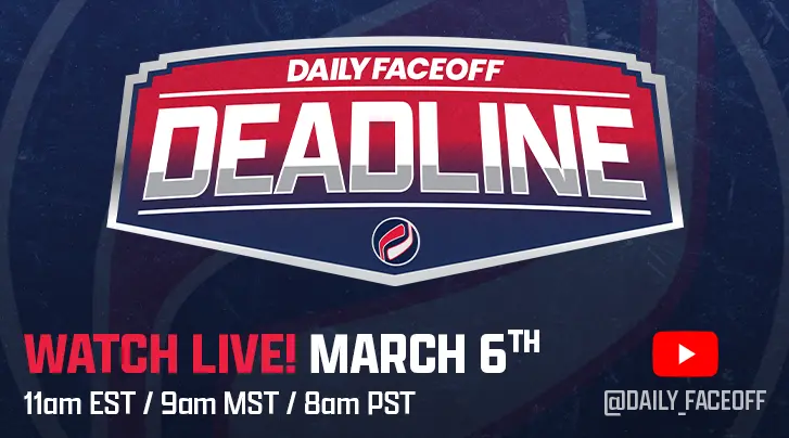 The 2026 Trade Deadline Special is going LIVE March 6th. Join the Daily Faceoff crew on Friday, March 6th from 8 AM-12:30 PM PT for wall-to-wall coverage of every single move as it happens. Get instant reaction, expert analysis, and exclusive insights from special guests throughout the day. Tune in LIVE on the Daily Faceoff YouTube channel and don’t miss a second of deadline day chaos.