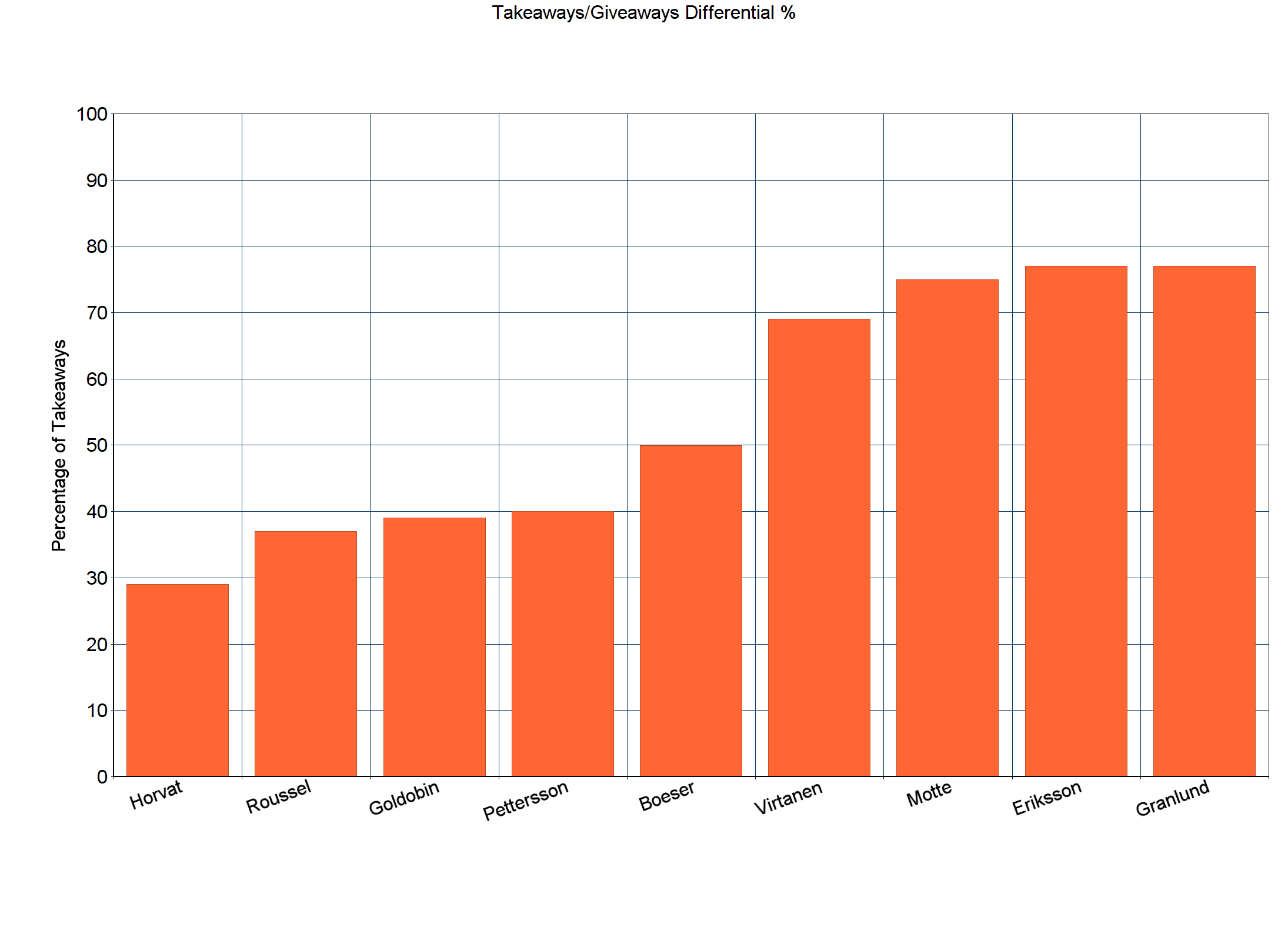 Yes, Unfortunate Erik has only 6 takeaways compared to 18 giveaways, meaning he is only on the winning side of just 25% of the turnovers he is involved in. But let’s focus on forwards. The chart below shows the percentage of each players turnovers that are takeaways (as opposed to giveaways). Forwards excluded below are those whose sample size is very small (meaning they are not involved in many turnovers in either direction, read into that as you will):