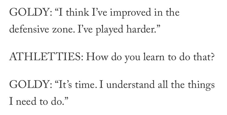 Is Goldy squeezing-his-stick, double-clutching, walking-on-eggshells, or otherwise underperforming out of fear of making a mistake? Quite possibly. As he told Botchford, a big part of getting better defensively is about knowing where to go and being decisive; that’s not something you can learn overnight, it takes time.