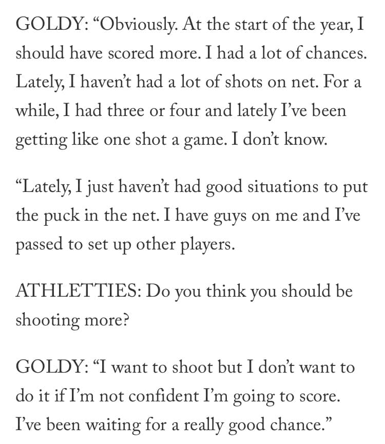 I like Goldy. I have from the start. It’s so much my brand that even I sometimes wish he would be traded so that I could move on from this drama. (No, I don’t. Don’t trade him. Don’t. Don’t you dare trade him for Michael Ferland. Just don’t.)