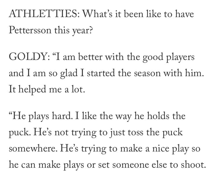 If you look at other players’ assists, you find that they, too, have favourite scorers. Of Brock Boeser’s 15 assists, 6 of them are on goals by Pettersson. So, while 44% of Goldy’s assists are on goals scored by a cosmically-gifted alien, the same is true of 40% of Boeser’s assists. Believe it or not, the same can be said of Elias Pettersson, the alien himself, if we examine his assists. His favourite target is Boeser, who has scored 45% of the goals Elias has set up. The numbers do not suggest that Goldy is uniquely dependent on Pettersson. Instead, they suggest that good players play well with other good players, and that the line of Goldy-Petey-Flow clicks well together. Goldy knows it: