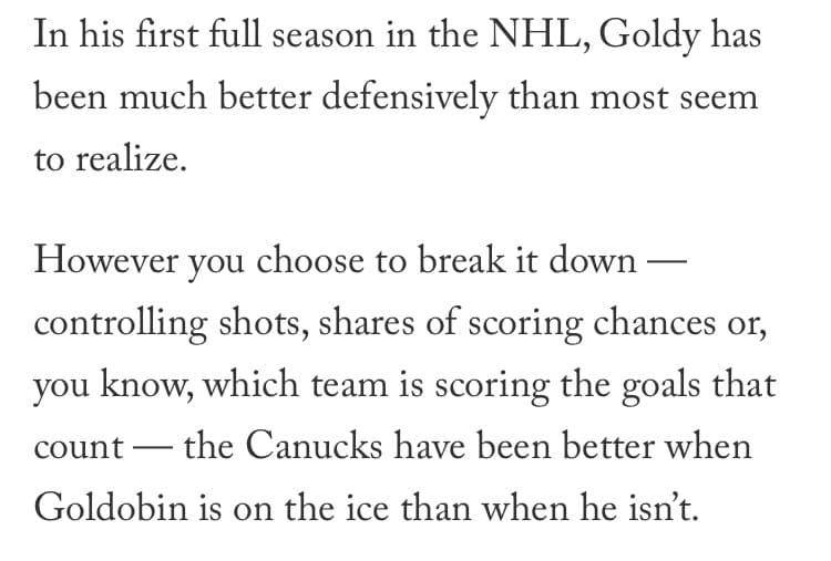 Maybe it’s time to ease up on the kid. The numbers indicate that he is one of the offensive drivers on this team, that he plays well with the best players, and that the team does better when he is on the ice. In fact, Elias Pettersson does considerably better with Goldy than without him: Darryl Keeping has repeatedly reminded us that Pettersson’s Corsi rating is much stronger when he plays with Goldy. Which makes sense, since Goldy is such an effective puck-distributor.