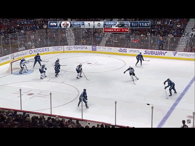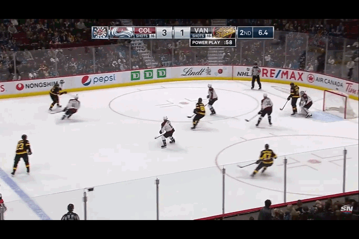 Goldobin is capable of making that cross ice pass to Gaudette to help increase his utility as a shooting threat. One of the most impressive things I have seen from Gaudette this year on the powerplay is his ability to realize when an offensive chance is coming. Gaudette can recognize when a scoring chance is coming and move out of position and towards the net. This type of positional fluidity could be great for Goldobin who is able to see when a player is about to make an attacking move towards the net.