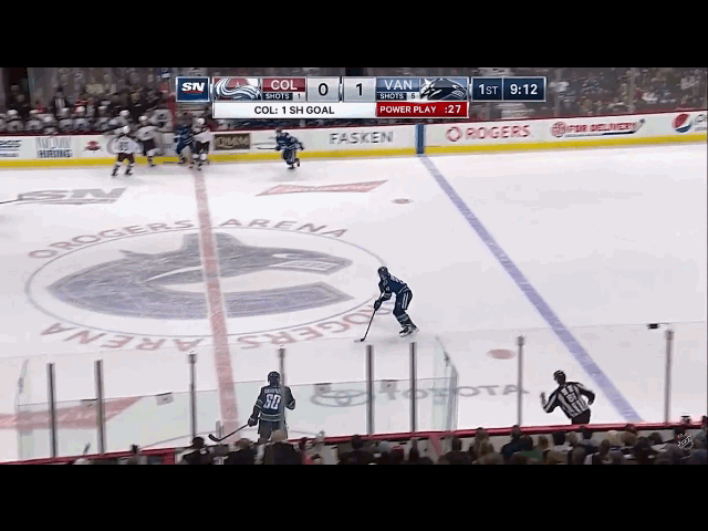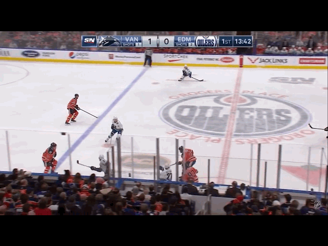 Goldobin can also be the player that carries the puck into the offensive zone, something that is tough for any team in the NHL. Here he moves the puck in after recognizing the penalty killers going for a line change and gets a quick scoring chance for Canucks great Markus Granlund.