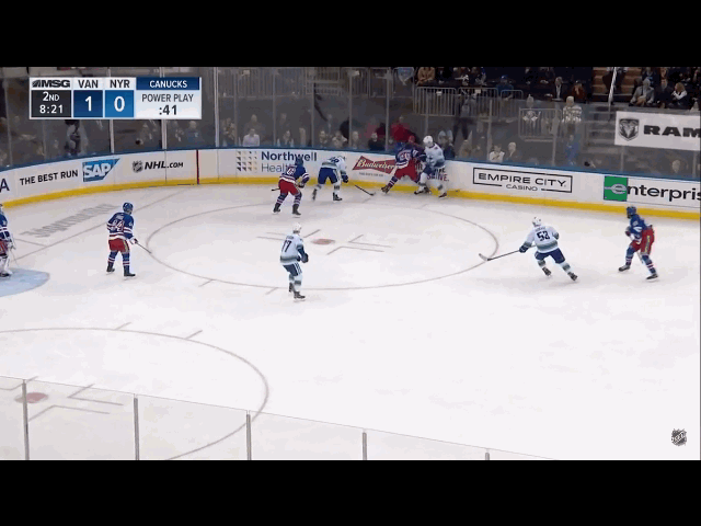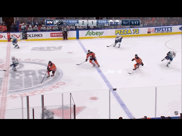 Pettersson actively makes himself available for the puck and when it lands on his stick he immediately knows where Goldobin will be for the easy tap in goal.