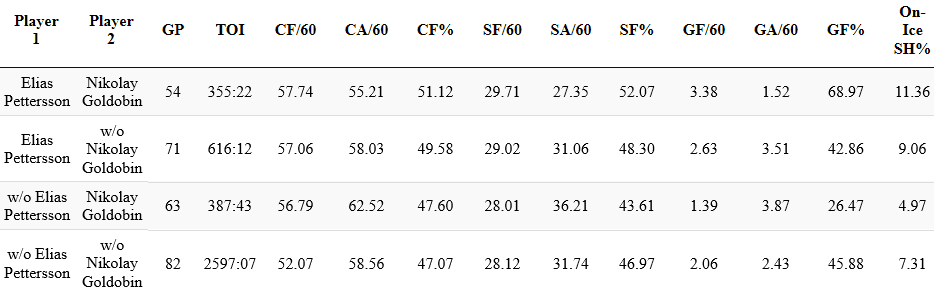 Pettersson likes to play with Goldy and it shows with his scoring stats.