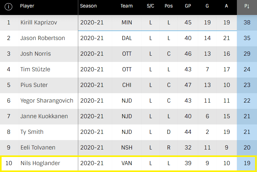 As I say that, here is the top-scoring group of rookies that I will be comparing to Höglander.