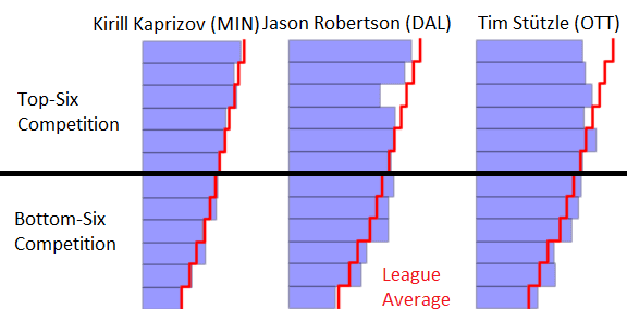 Höglander plays against opposing teams’ top-six well above league average while being below league average against teams’ bottom-six players.