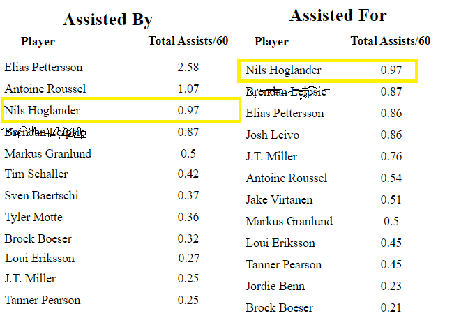 Over the past three seasons, Horvat has assisted on or been assisted by Höglander at a very high rate compared to the rest of his linemates.