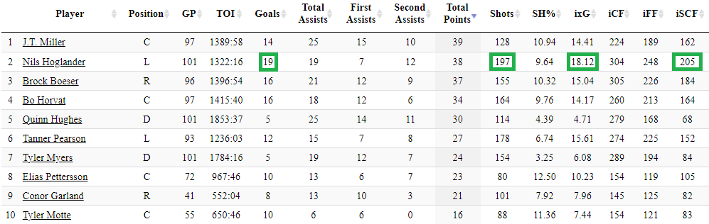 There have been some defensive deficiencies in Höglander’s game through his short NHL career but one thing is for certain, he knows how to generate offence when he is on the ice. Höglander is a five-on-five star when it comes to creating offence. At five-on-five, he is first in goals, shots on net, individual expected goals, and individual scoring chances since joining the team last year.