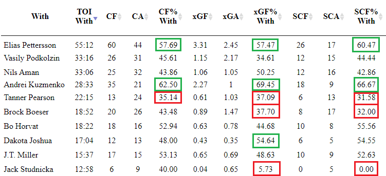 In comparison, Pettersson has played 10+ minutes with eight different forwards, Miller has played 10+ minutes with nine forwards, Aman has done it with eight, and Kuzmenko with nine.