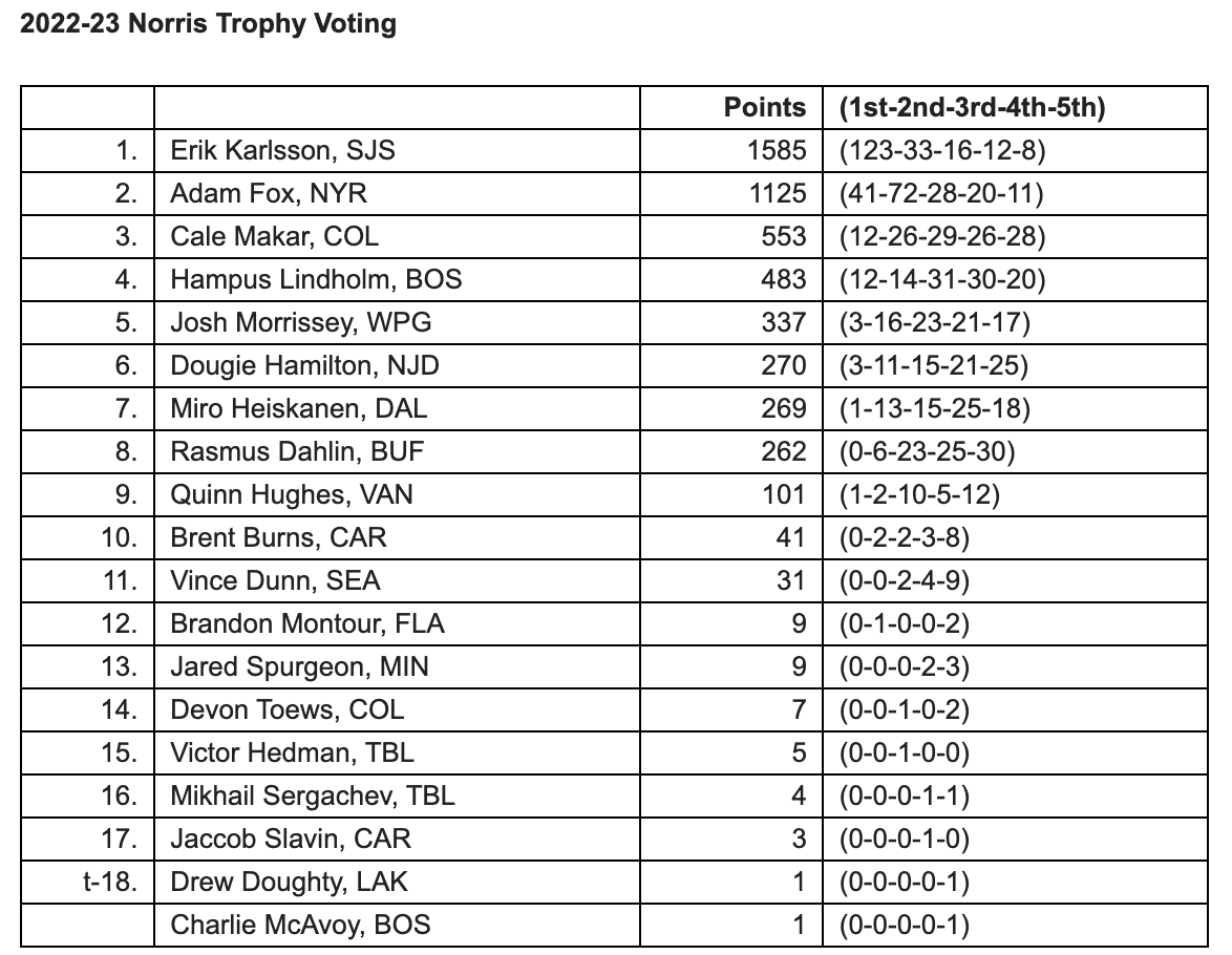 Instead, Hughes finished 8th in Norris Trophy voting, picking up fewer votes than Makar, Fox, Hampus Lindholm, Josh Morrissey, Dougie Hamilton, Rasmus Dahlin, and of course, Erik Karlsson, who cleaned up the vote en route to winning the award. Here is the full breakdown from the 2022-23 Norris Trophy vote: