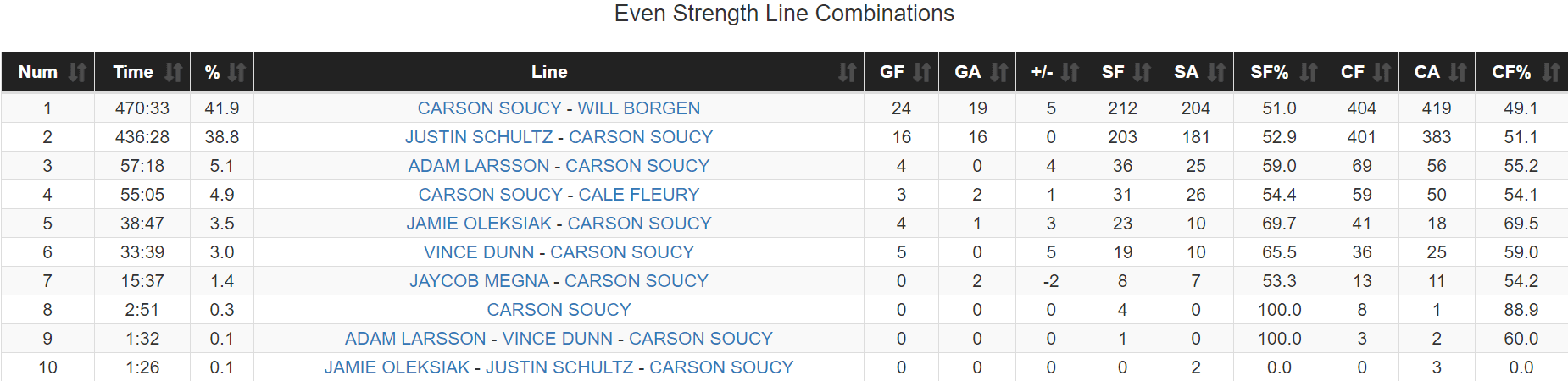 But 30% of his rookie campaign was also spent next to a LHD in Brodin, and in those instances Soucy was definitely playing on the right. Brodin was also Soucy’s most-frequent PK partner.