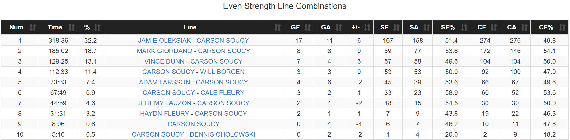 In that year, Soucy’s top three partners were all LHD in Oleksiak, Dunn, and Mark Giordano.
