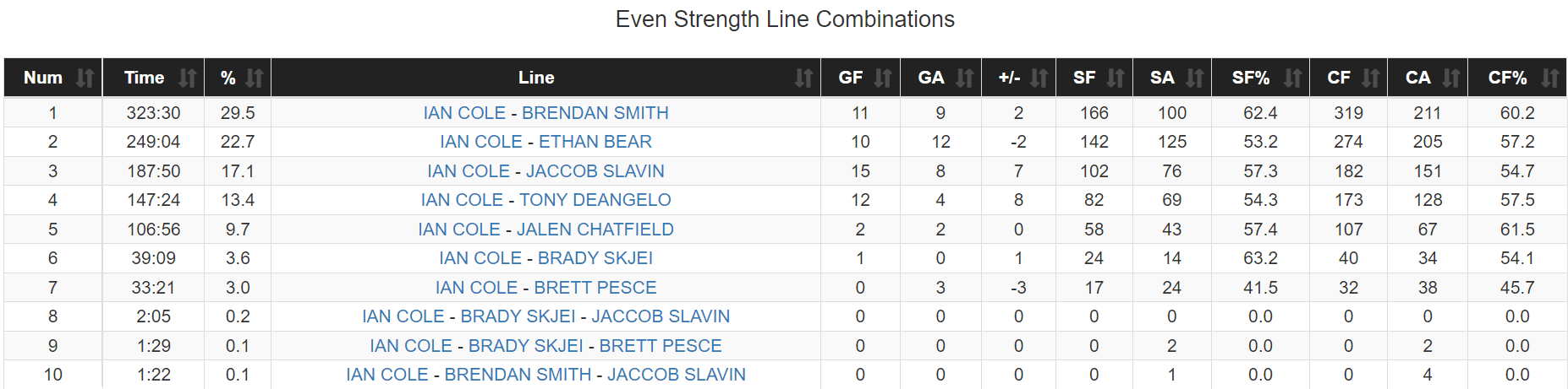 His 2021/22 campaign with the Carolina Hurricanes saw Cole split his even-strength time fairly evenly between four primary partners in Brendan Smith, Ethan Bear, Jaccob Slavin, and Tony DeAngelo.