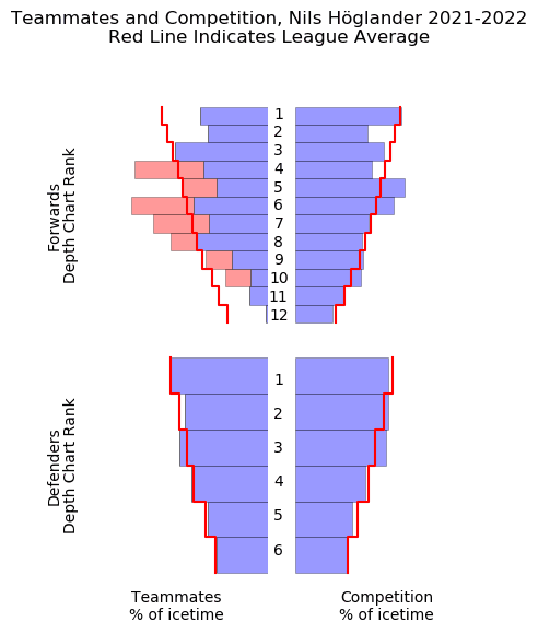 Credit or not, head coach Travis Green is starting to notice. Höglander’s quality of competition in 2021/22 looks a little weird on account of the limited data, but he’s already spending more time against the opposing top-six than he did as a rookie.