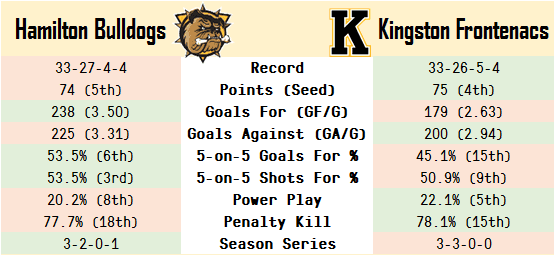Cole Candella’s Hamilton Bulldogs and the Kingston Frontenacs are a close matchup. While the Bulldogs have scored a lot more goals, the Frontenacs have allowed a lot fewer. Hamilton has controlled play and produced more favourable results at 5-on-5, while Kingston has an edge in the special teams battle. The series season between the two teams was relatively even.