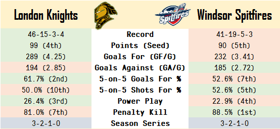 The Knights were the better team in the regular season (although the two sides split the season series evenly). The Knights’ power came largely from their ridiculous goal totals – their 4.25 goals per game are among the best in the CHL, and they weren’t dominant offensively at both 5-on-5 and with the man advantage. Note the Knights’ goal ratio with respect to their shot ratio: only the Erie Otters had a higher shooting percentage among OHL teams than the Knights’ 11.3% conversion rate.
