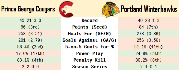 In many other ways, the Cougars were a superior team to their upcoming opponents, the Portland Winterhawks. Though the Winterhawks managed more goals (buoyed by their superior power play), the Cougars were much more adept at keeping the puck out of their own net, as as a result they carried a dynamite 5-on-5 goal ratio.