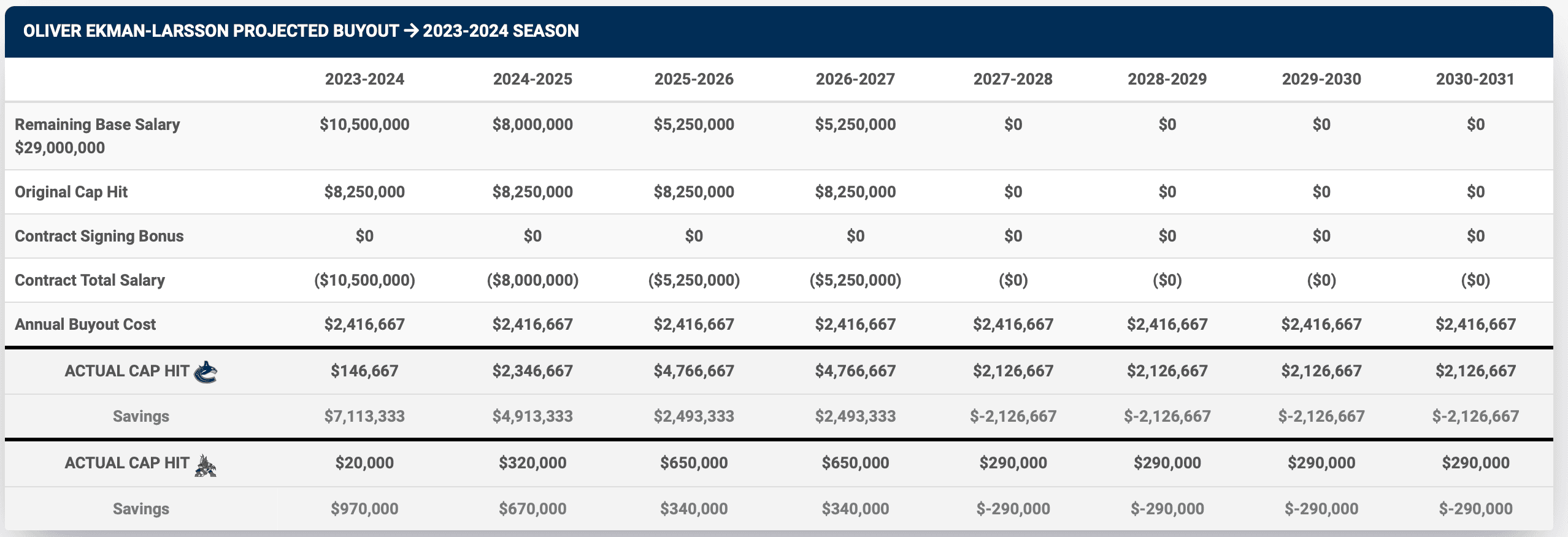 If the Canucks were to buy out Ekman-Larsson this offseason, this is how the money would shake out. The team would save just over $7 million in cap space for next season, as well as just under $5 million in the year after that. However, the Canucks would have to take a penalty of $2.126 million each season between 2027-28 and 2030-31.