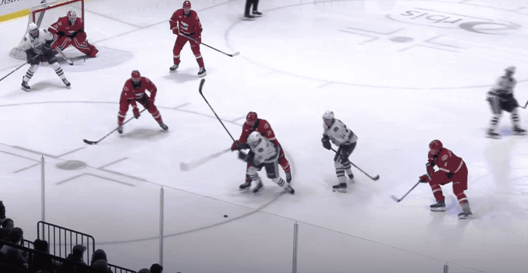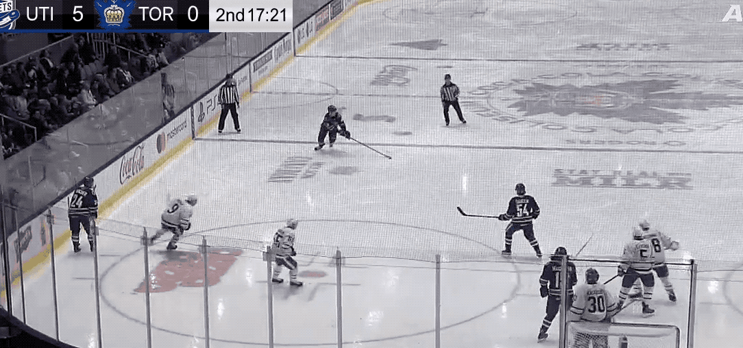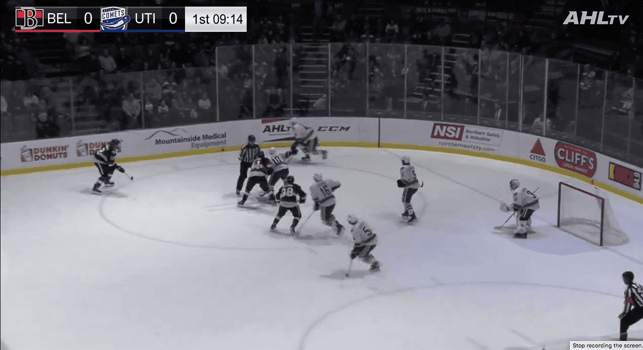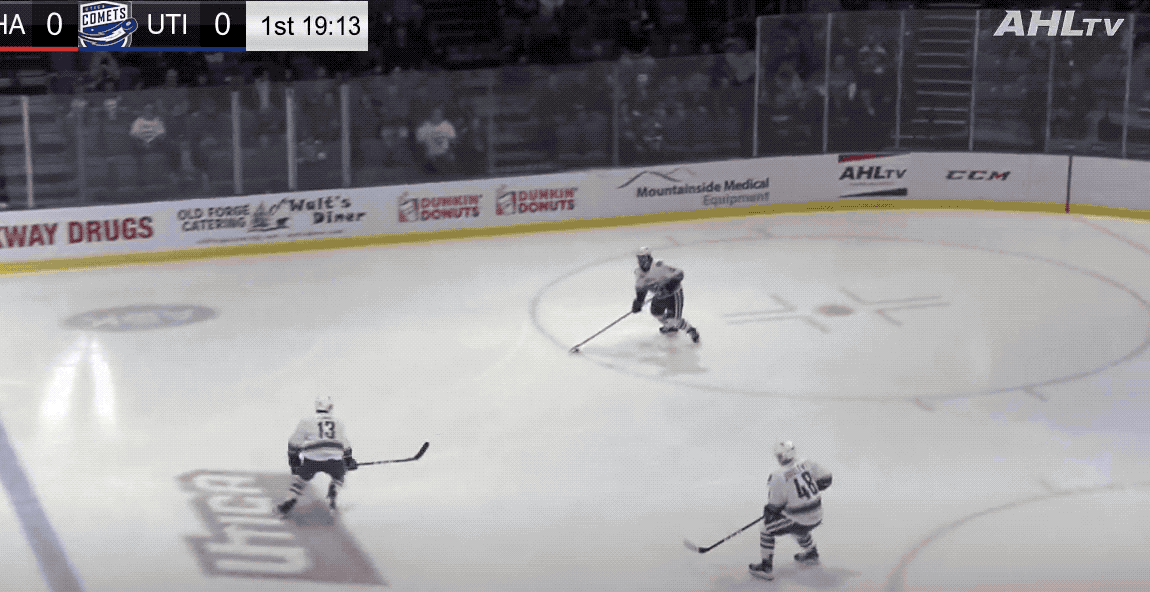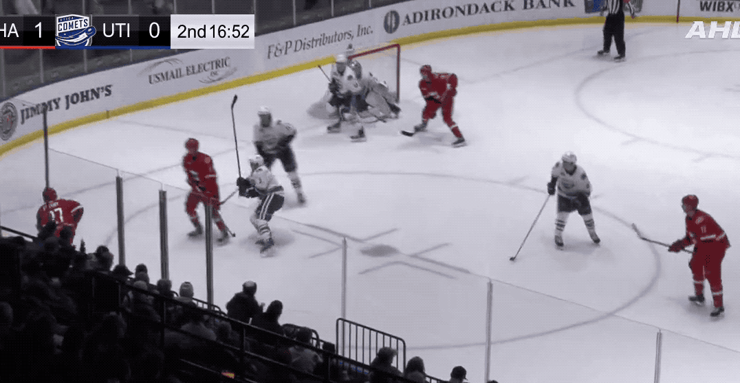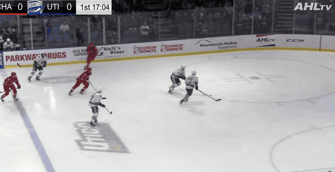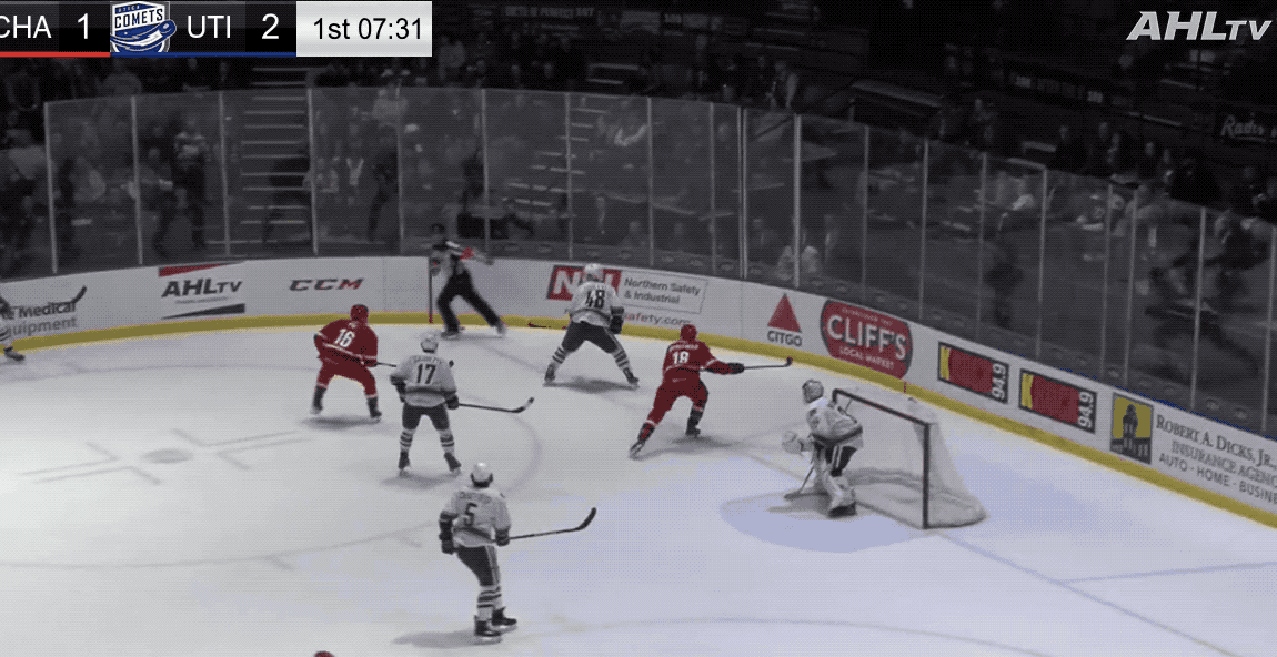 Now we’ll transition into another strength of Juolevi’s game, his offensive contributions. His six points place him in the top five among rookie defenders in the AHL. Juolevi is currently doing his best offensive work on the power-play, where he’s produced five of his six points thus far. As the Point-Man/Quarterback on Utica’s first unit, he gets the most touches on the man advantage and it’s up to him to orchestrate scoring chances for the leagues seventh-ranked power-play.