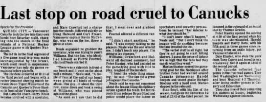 As it shook out, Neale became involved with a spectator in the stands and defenceman Marc Crawford “led a charge into the stands,” The Vancouver Province wrote.