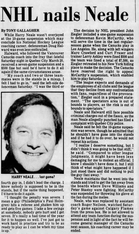 Neale said he felt the 10-game suspension was severe, though he admitted that he shouldn’t have gone into the stands and if he had it to do over, he would not repeat his actions.“I realize I deserve something, but I didn’t think it was going to be that stiff,” he said. “Compared to other league judgments, it might have been less damaging for me to molest an official. I know I shouldn’t have done it, but I still think of what might have happened if I just stood there and did nothing to pull the guy (fan) away.”Neale maintains that he went into the stands and tried to get the fan away from the boards where Dave Williams and Peter Stastny were fighting. McCarthy was suspended for throwing his glove at the fan during the melee.Neale, who was replaced by assistant coach Roger Neilson, watched Saturday’s game against Calgary Flames from the press box. He is not allowed to attend any team function during the suspension and in light of the fact he will become general manager of the Canucks next season, his coaching career may be ended.