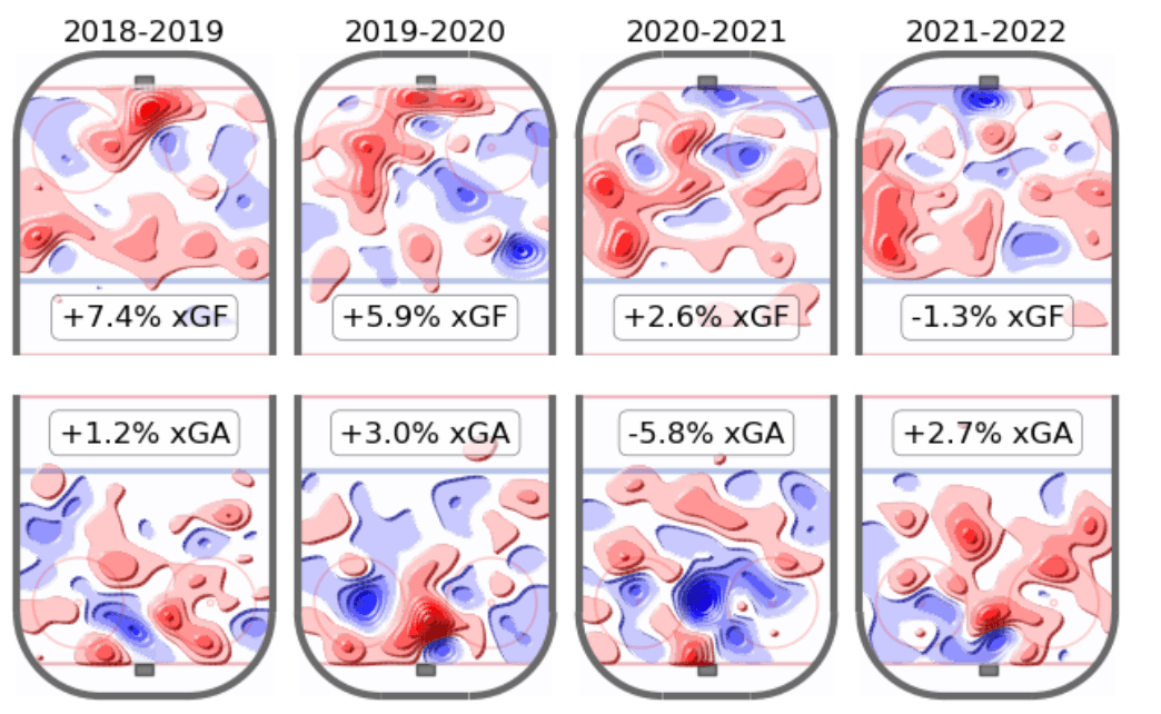 The following charts from HockeyViz paint a similar picture, as Horvat’s isolated impact shows a player who consistently drives offence at a positive rate while also being somewhat leaky in his own end. The red blobs on the graph indicate higher than average shot volume while the blue represents a lower volume, and as you can see, there is usually a lot of red in front of both the opposition’s net and the Canucks’ own goal.