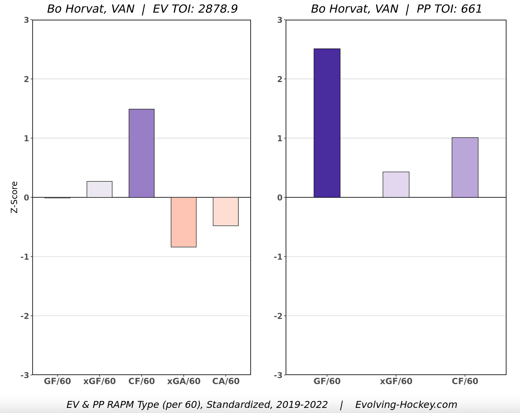 Between 2019-2022, Horvat scored 1.57 points per 60 minutes at five on five, which is merely a decent second-line rate and places him 167th out of 222 forwards (25th percentile) who have logged at least 2000 five on five minutes during that span.