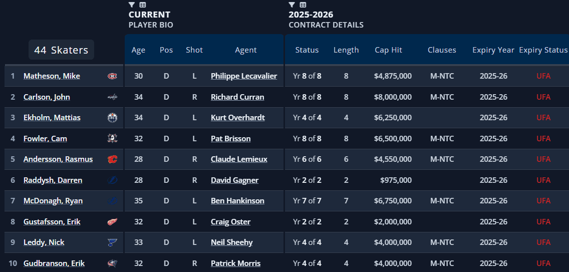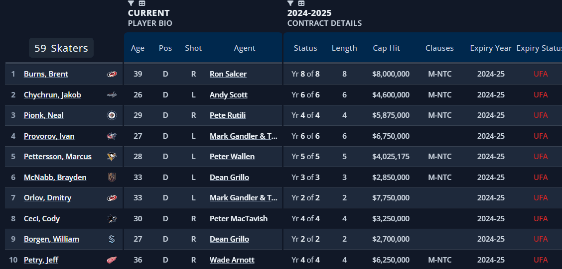 To prove it, let’s focus on the blueline specifically. While we don’t have time to look at every NHL D who might be available – at least not in this singular article – we can at least look at the market for defenders who have either one or two years remaining in their contract, which seems to be Allvin’s typical target range.