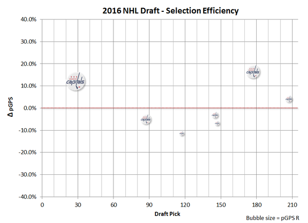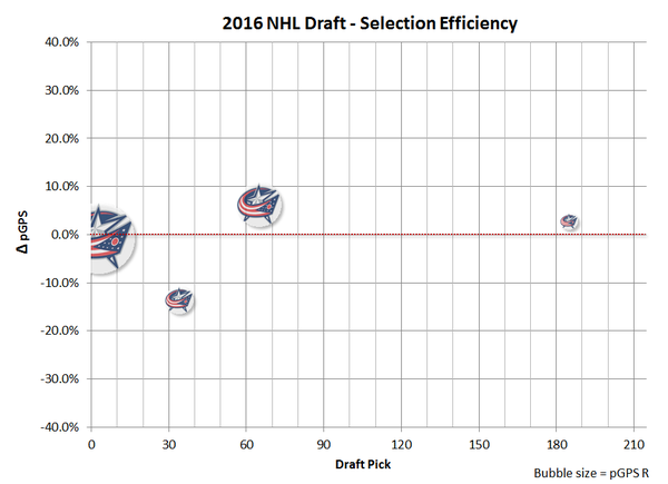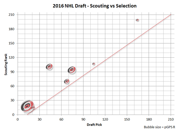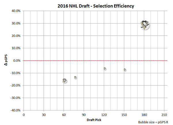 The Hurricanes lost value both in the eyes of traditional scouting ranks and in the view of pGPS. They’ll still get an NHLer out of this class (more than likely it will be Jake Bean), but by the numbers, their draft decisions cost them a chance to get multiple players. One other thing that will be interesting to follow from this draft class is the divergence of opinion on both Gauthier – scouts were bullish on the QMJHL sniper, while pGPS was skeptical.