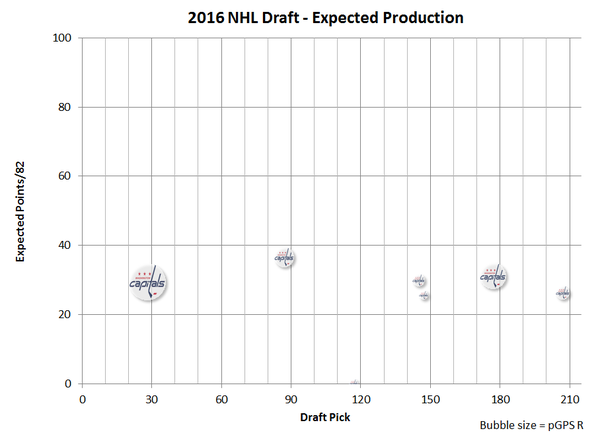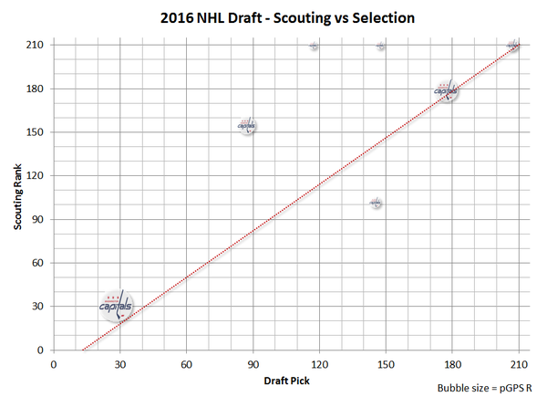 Despite going a few spots ahead of his ranking, pGPS suggests that the Caps gained value by selecting Lucas Johansen at 28th. It’s also bullish on Chase Priskie (179), and sees that as the best value for position pick of Washington’s class.